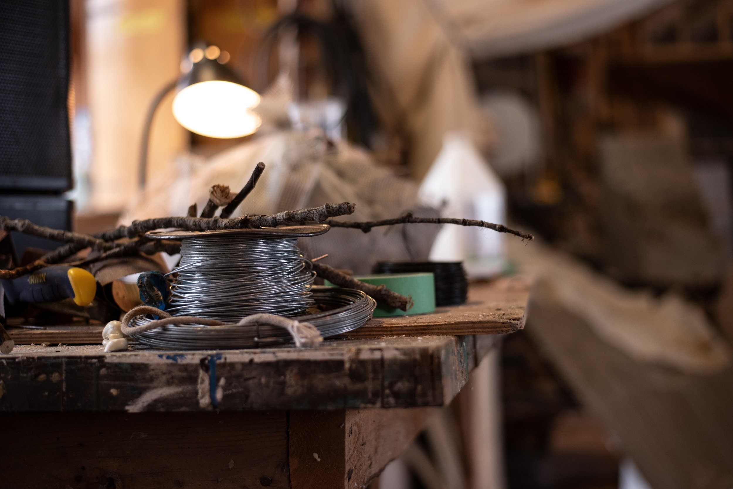 An immersive section exploring the artist’s studio as a site of process, experimentation and embodied human creativity.