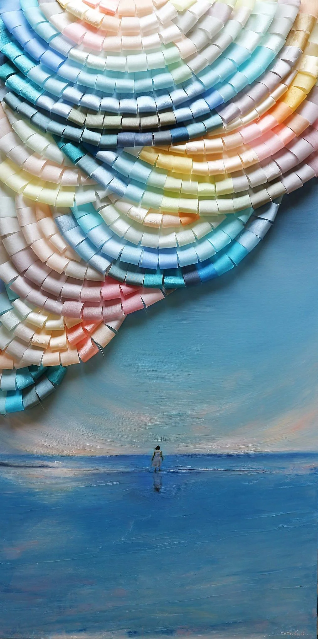 Directly influenced by the oil paintings of Claude Monet, the artworks of Miho Endo feature lily ponds, the seaside, and flower fields bathing in the summer sun. Similar to Monet’s water lilies, Endo applies brush strokes in a particular manner that gives her paintings a blurry, almost dream-like quality. It is this poetic effect that stimulates within the viewer a sense of peace and meditation. Similarly, Korean artist Sunhwa Jeon applies oil on canvas to create peaceful landscapes of the ocean. In her artwork, titled “End of Season”, the soft brushstrokes are accentuated with the addition of multi-colored fabric on canvas, giving the work a new dimension..