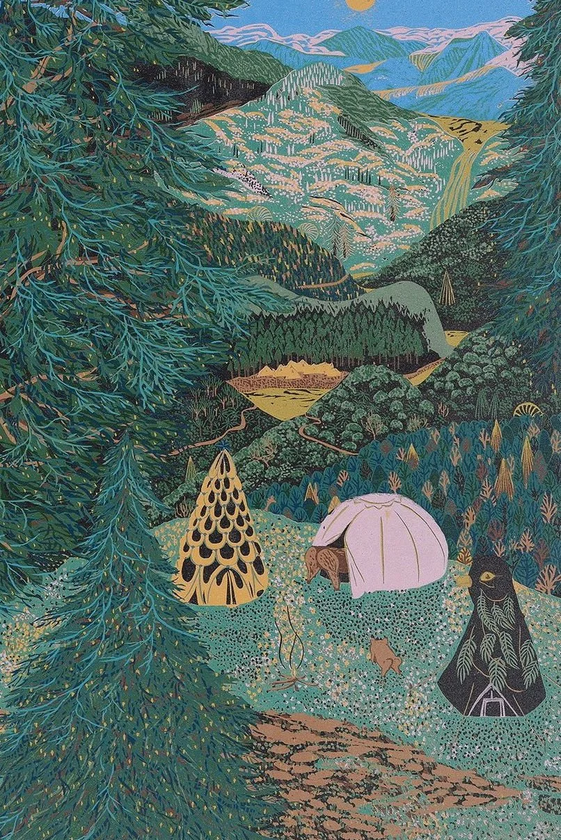 The works of Kang Hyunkyung present a nature never seen before — evoking its indisputable power. Throughout her series, “Gazing”, her paintings feature rich, dark green backgrounds that spotlight animals such as foxes, lions, and cheetahs. The ominous stares of the subject at the viewer almost convey a tinge of sadness, which allude to the detrimental damage of human civilization on the habitat of wild creatures. Other paintings within the same series evoke the innocence of nature by featuring the parental love of the animal subjects. Japanese artist Ryuichi Tomiyama achieves a similar effect with her painting, “Lion” (2019). The artwork depicts a lion staring upwards — as if mesmerized by the colorful brushstrokes that the artist applied to the sky above. The painting, amplifying the solitude of the lion seems to emphasize its vulnerability in a world where humans are lurking predators.